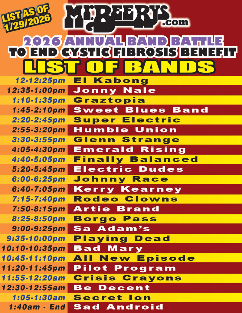CYSTIC FIBROSIS BENEFIT 2026 BAND LIST (as of 1/29/2026 at 4pm)